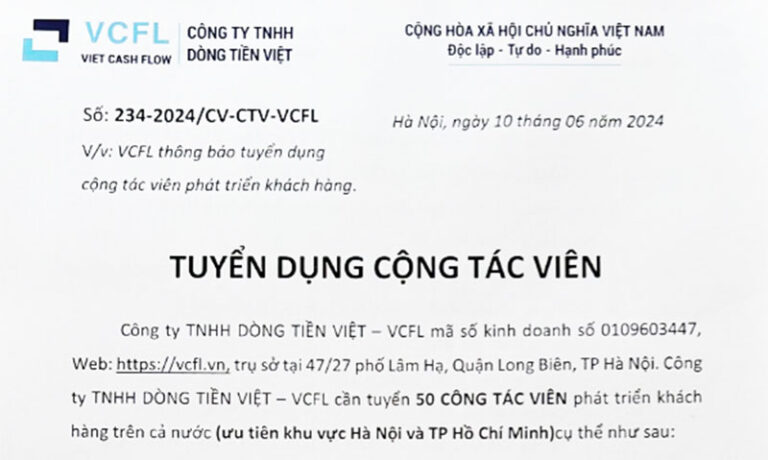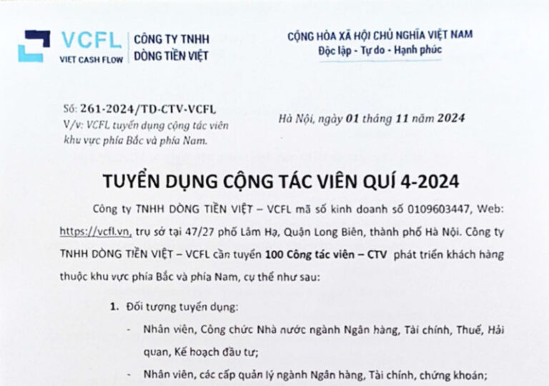 Tuyển dụng cộng tác viên quý 4 năm 2024 Công ty TNHH Dòng Tiền Việt - VCFL cần tuyển 100 cộng tác viên - CTV phát triển khách hàng thuộc khu...