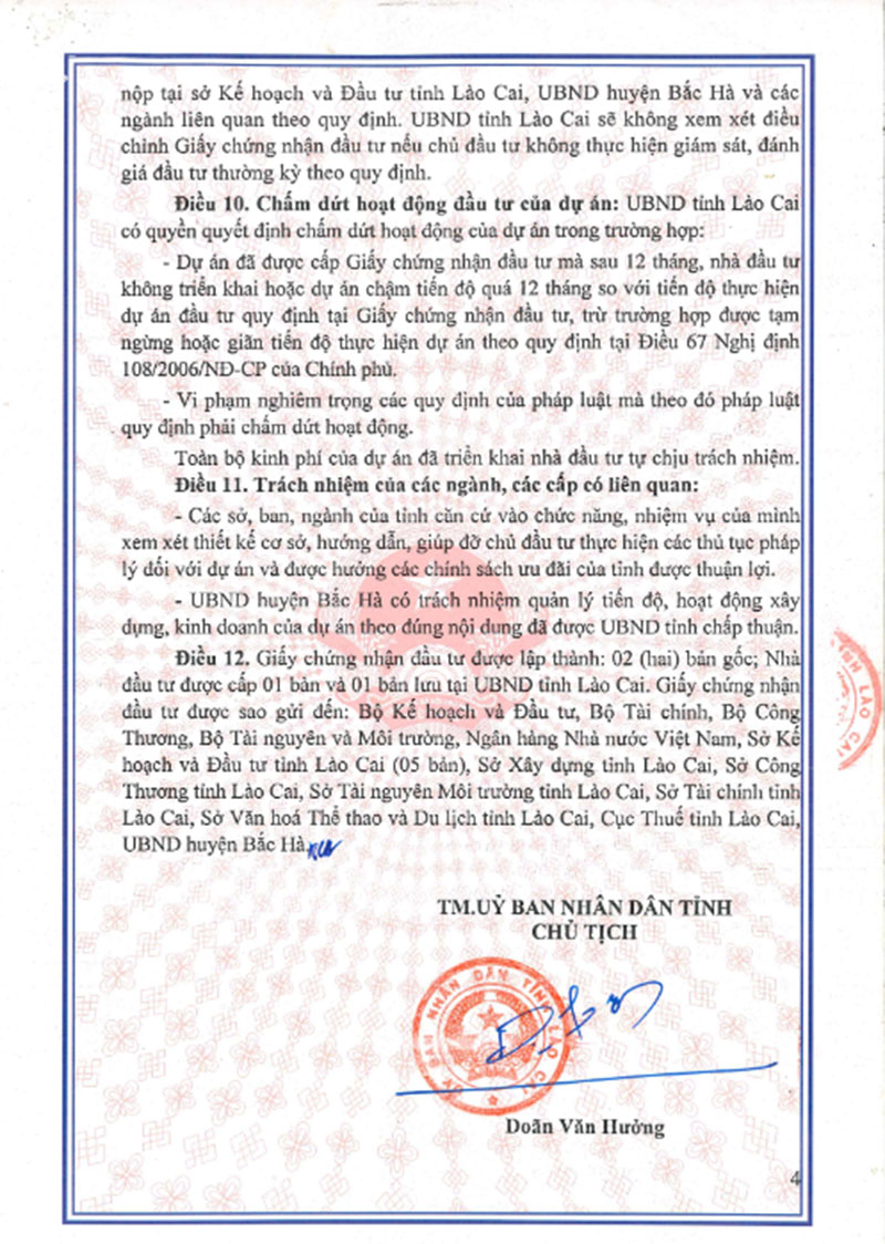 GIẤY CHỨNG NHẬN ĐẦU TƯ Số: 12 121 000 451 do UBND TỈNH LÀO CAI Cấp ngày 30/01/2015.